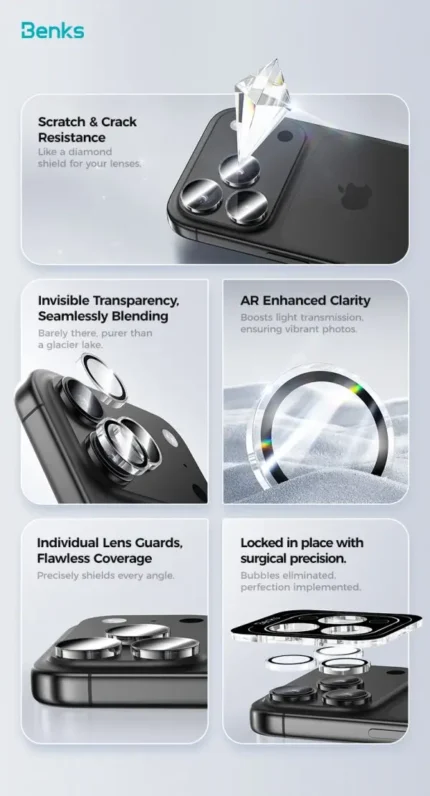 Description iPhone 16 Pro Max 16 Pro 15 Pro Max 15 Pro Benks GlassWarrior Lens Protector – Clear – 6948005904845